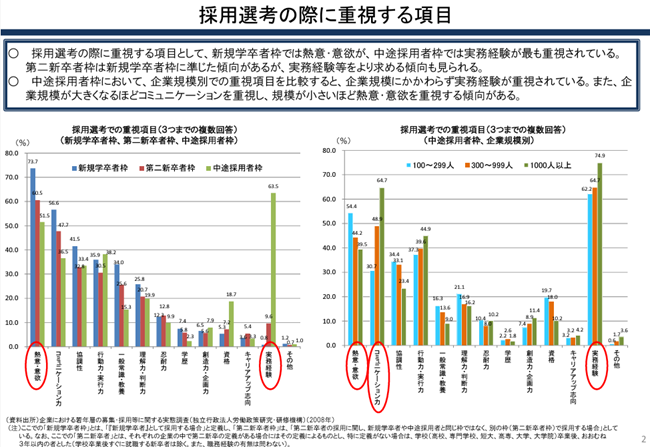 厚生労働省の「若年者雇用を取り巻く現状」によると、中途採用の選考で重視する項目は、「実務経験」に次いで、「コミュニケーション能力」や「熱意・やる気」が多くなっています。