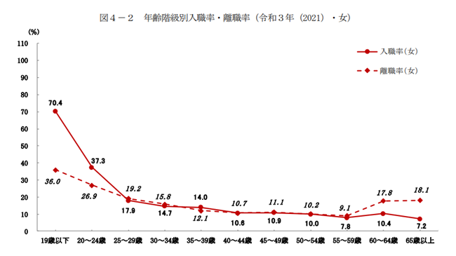 引用:年齢階級別の入職と離職 令和3年1年間の入職率(厚生労働省)