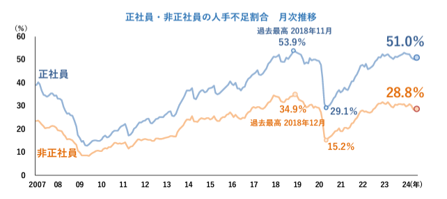 帝国データバンクの「人手不足に対する企業の動向調査」によると、正社員・非正社員ともに人手不足の割合は増加傾向にあります。